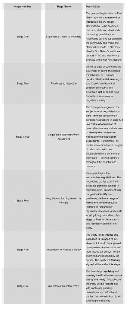 I believe B.C. Treaty Process is a necessary first step for both the First Nations and B.C. governments. The process was established in 1991, which provides a guideline for treaty-making that includes a list of 19 principles for negotiations. However, these 19 principles are overly vague, allowing the parties a considerable amount of leeway to how they fashion their participation in the process. Because of this, many treaties falls short. One topic that prevents negotiation from continuing is the differences between the non-Aboriginal and First Nation sides on the “Understanding of Aboriginal Titles.”